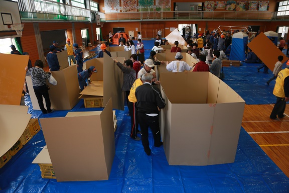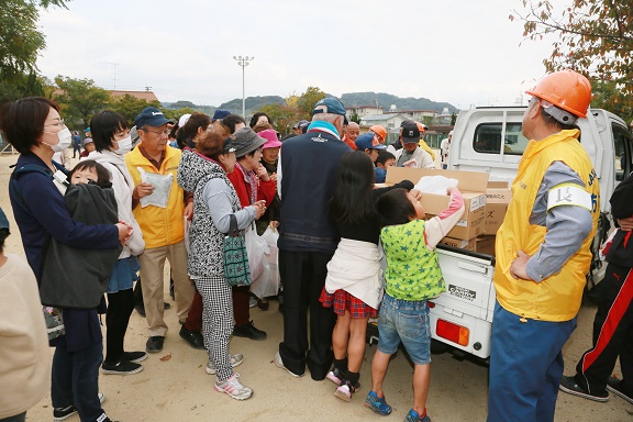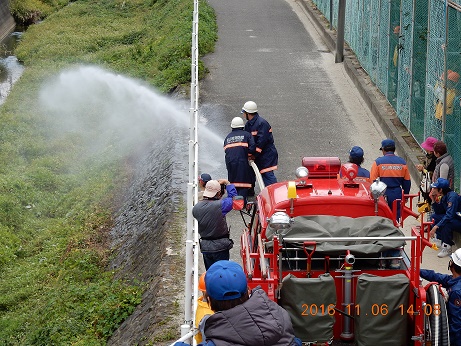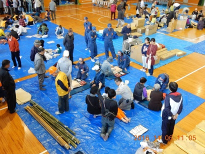 潮見地区合同防災訓練 2016年11月7日潮見地区自主防災連合会, 構成団体活動記録shiomi_master 11月6日 日曜日 潮見小学校体育館・グランド 地域住民約300名が参加し、避難所疑似体験、段ボールを使った避難用品、 うどんの炊き出し、グランドでの地震体験、消火器の使い方、煙ハウス体験、 消防レスキュー隊の実演と消防車の放水もあり、参加者は最後に非常食の配布 を受けて解散しました。 写真 潮見防災連合会 藤村和男さん