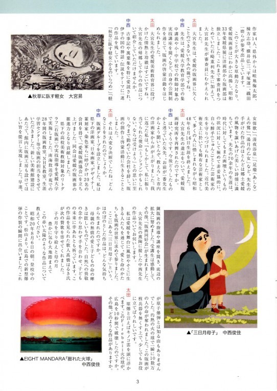 版画家 中西俊佳さん(吉藤在住) 2019年4月15日まち協新着ニュースshiomi_master 松山市文化協会発行の情報誌、文化情報松山『きらめき』2019年春号:「きらめき対談」に吉藤在住の中西俊佳さんが登場されました。 中西俊佳さんは、愛媛版画界のパイオニア的存在で、現代日本を代表する版画家です。 「愛媛の版画について語る 恩師・大宮昇と凸凹版業62年の人生」など、版画制作にかける思いと、版画の魅力について語っておられます。 (情報提供・記事提供 吉藤 能田昭男さん)